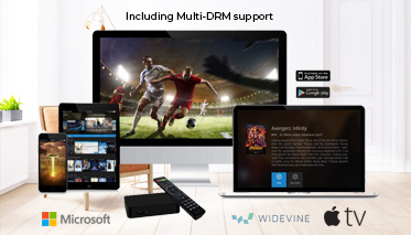 Digital Rights Management with support for Multi-DRM, Widevine, FairPlay and PlayReady.
